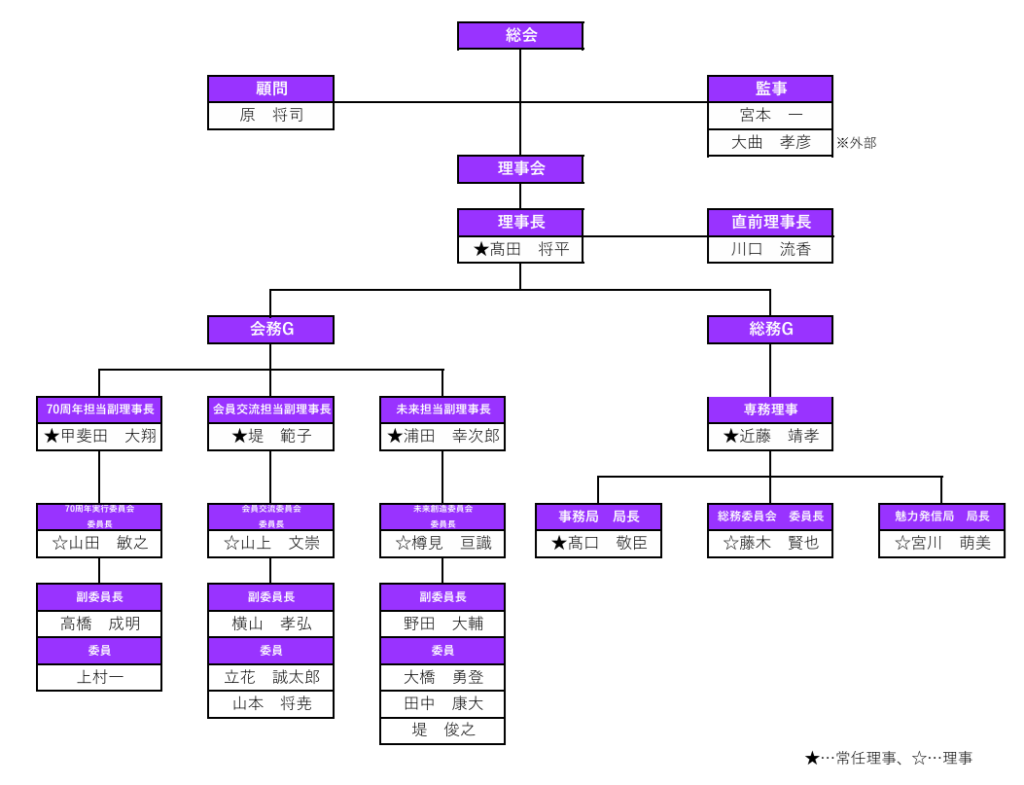 まずは、80周年ビジョンを策定するために、65周年から69周年の事業検証をし、先輩諸兄姉が紡いできた精神と志を深く理解します。そして、明るい豊かな社会を実現するために、60周年の検証を踏まえ70周年提言を策定し、会員の共通認識を高めます。さらに、先人の想いを礎に新たなる歴史の扉を開くために、70周年記念式典・祝賀会を厳粛かつ盛大に開催し、関係者の皆様との固い絆と未来への原動力を創出します。また、市民と共に地域の未来を描く契機を創出するために、70周年記念事業を実施し、共感と連携の輪を広げます。そして、誇りと志を継承するために、70年の歩みと想いを記念誌として結実し、歴史を後世に刻みます。さらに、70周年を成功に導くために、理念を体現する例会を計画・実施し、組織の一体感と使命感を高めます。また、卒業生の想いを引継ぎ今後の活動への原動力を生み出すために、卒業生の貴重な経験を学ぶ例会を実施し、成長に繋げていきます。そして、委員会メンバーの育成及び動員をより一層推進するために、一人ひとりが積極的に参画し、互いの信頼を深め組織の礎をより強固なものにします。